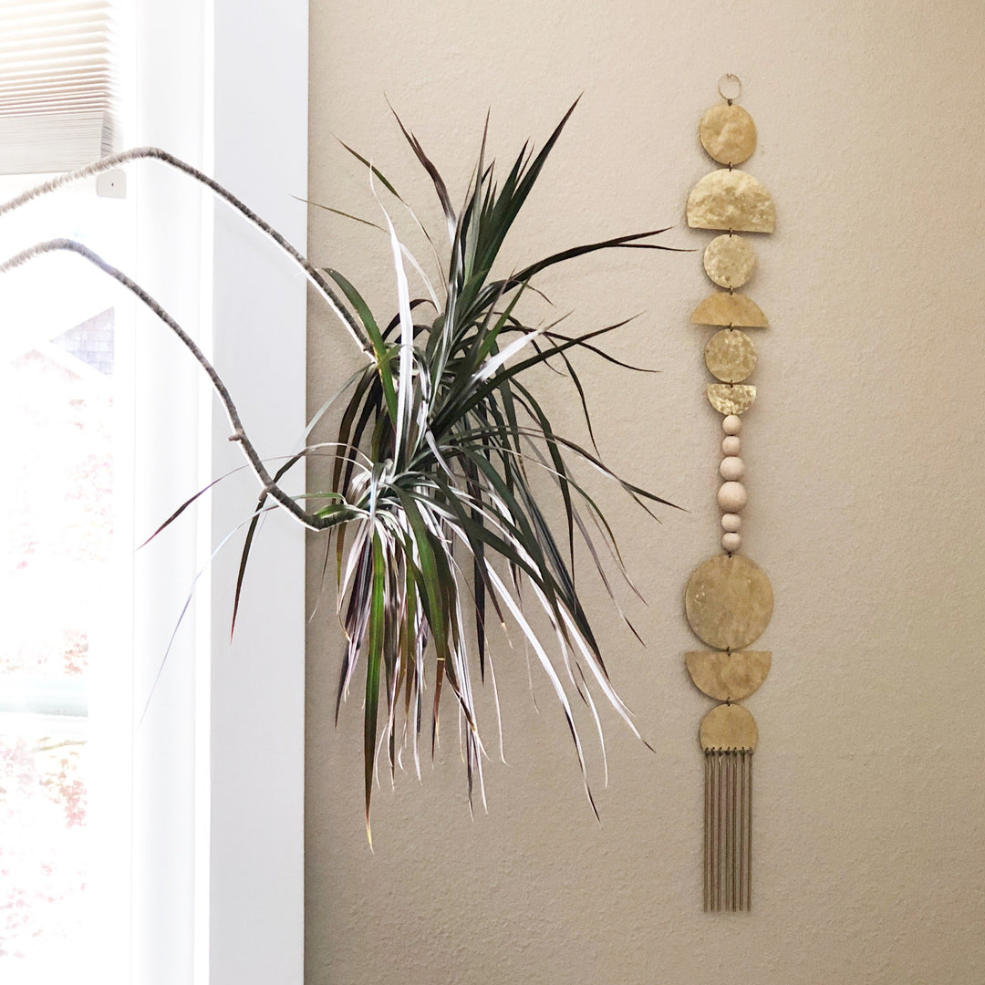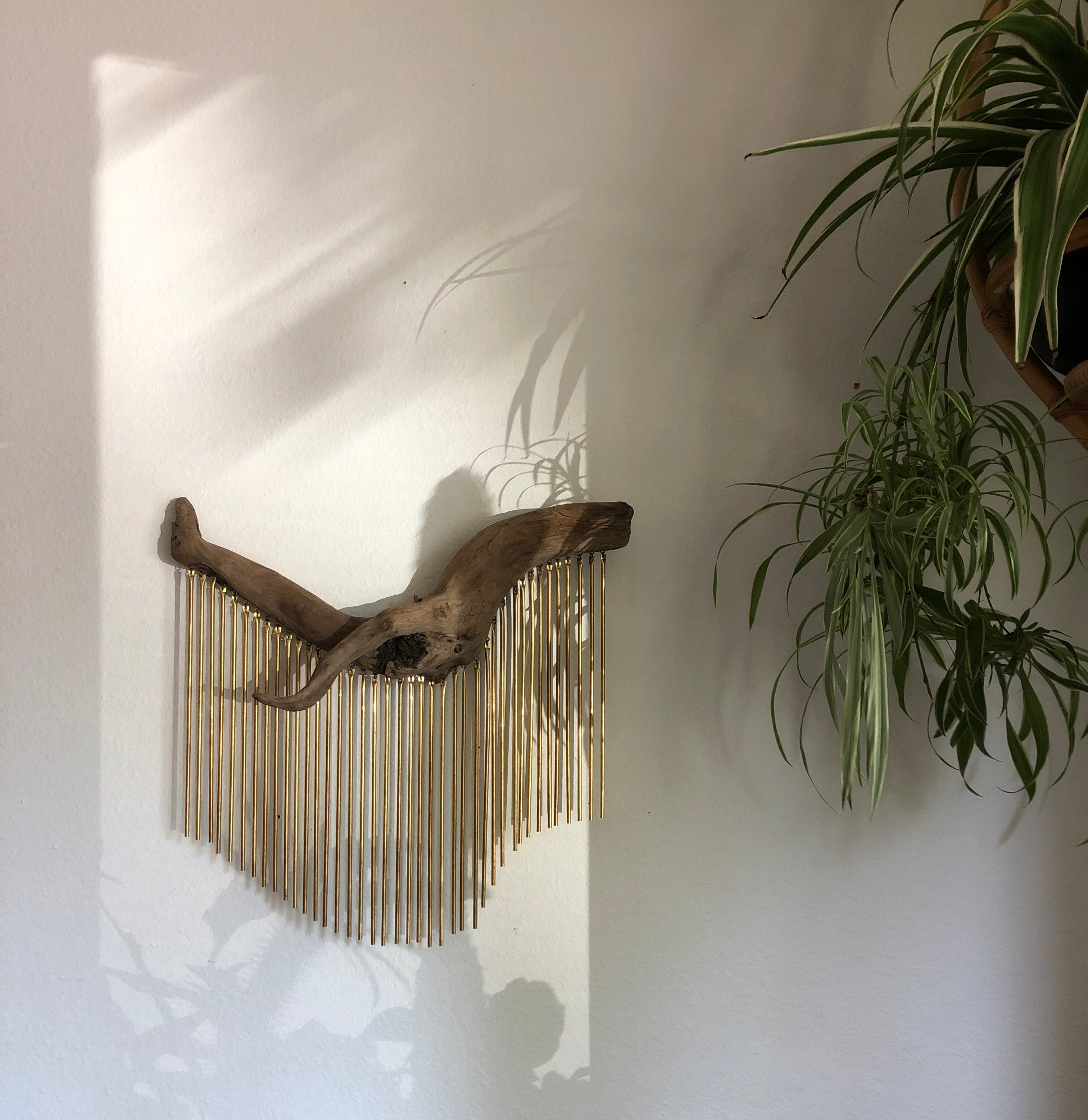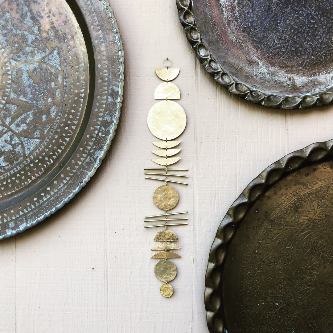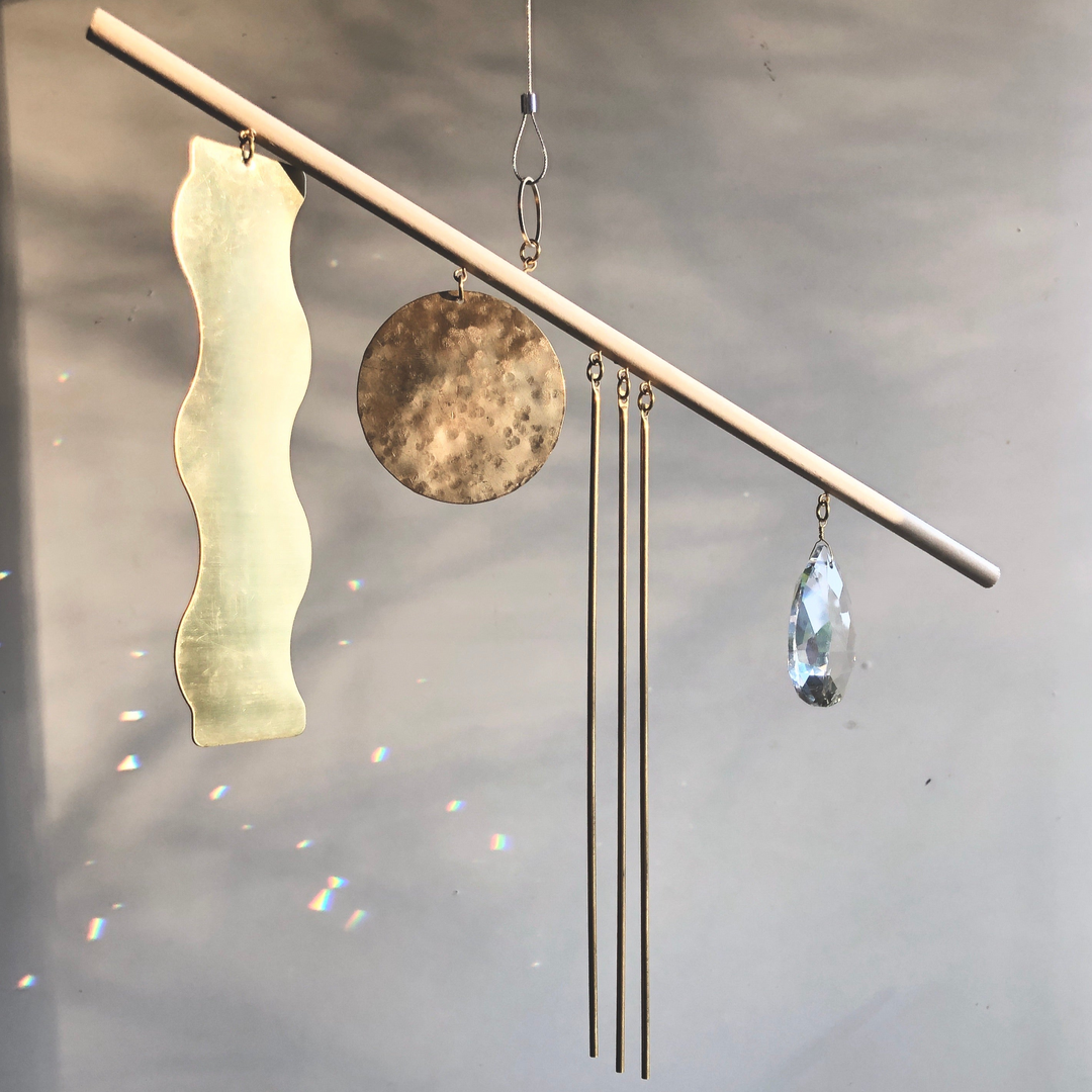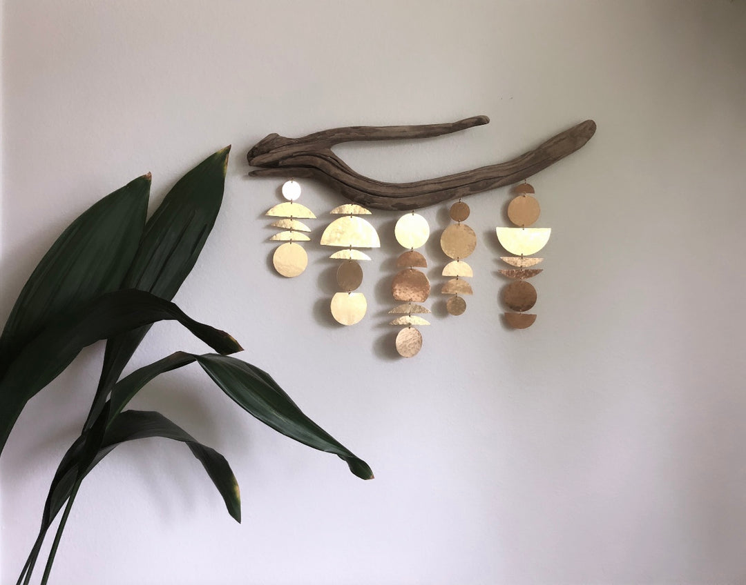 Driftwood + hand cut and hammered brass wall art/mobiles capturing celestial rhythms, ever changing light and reflections on water.
