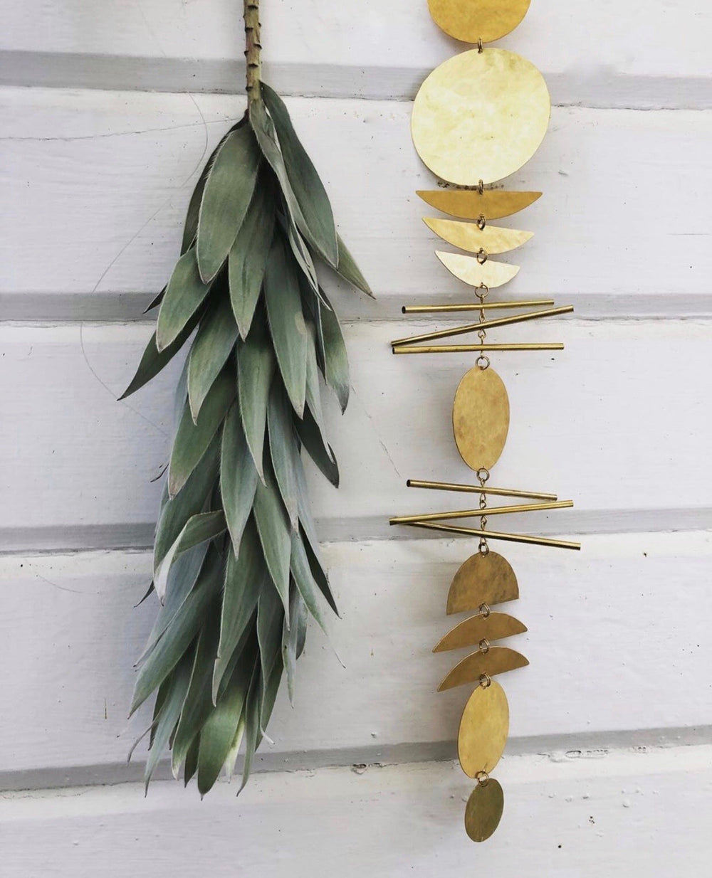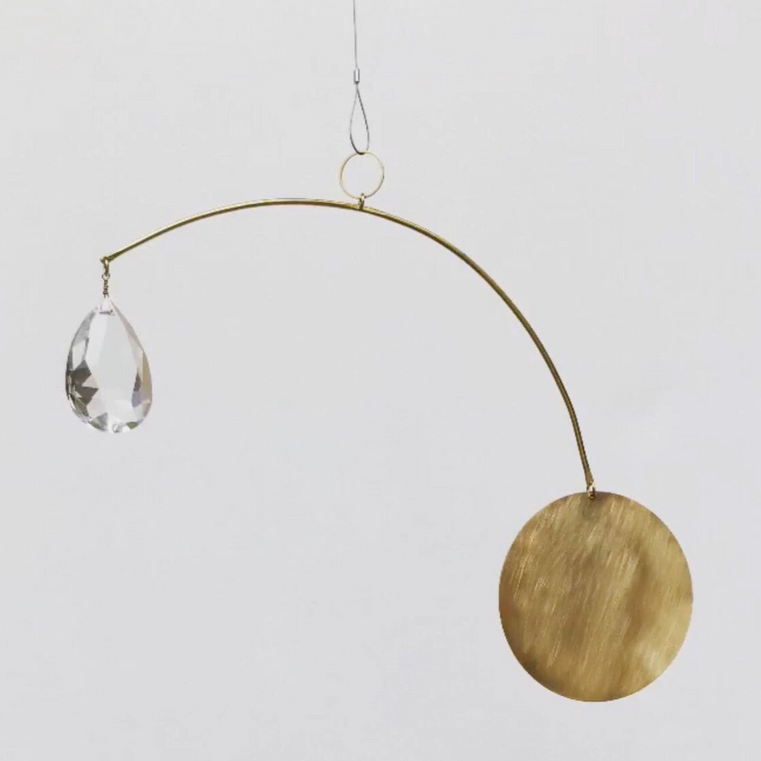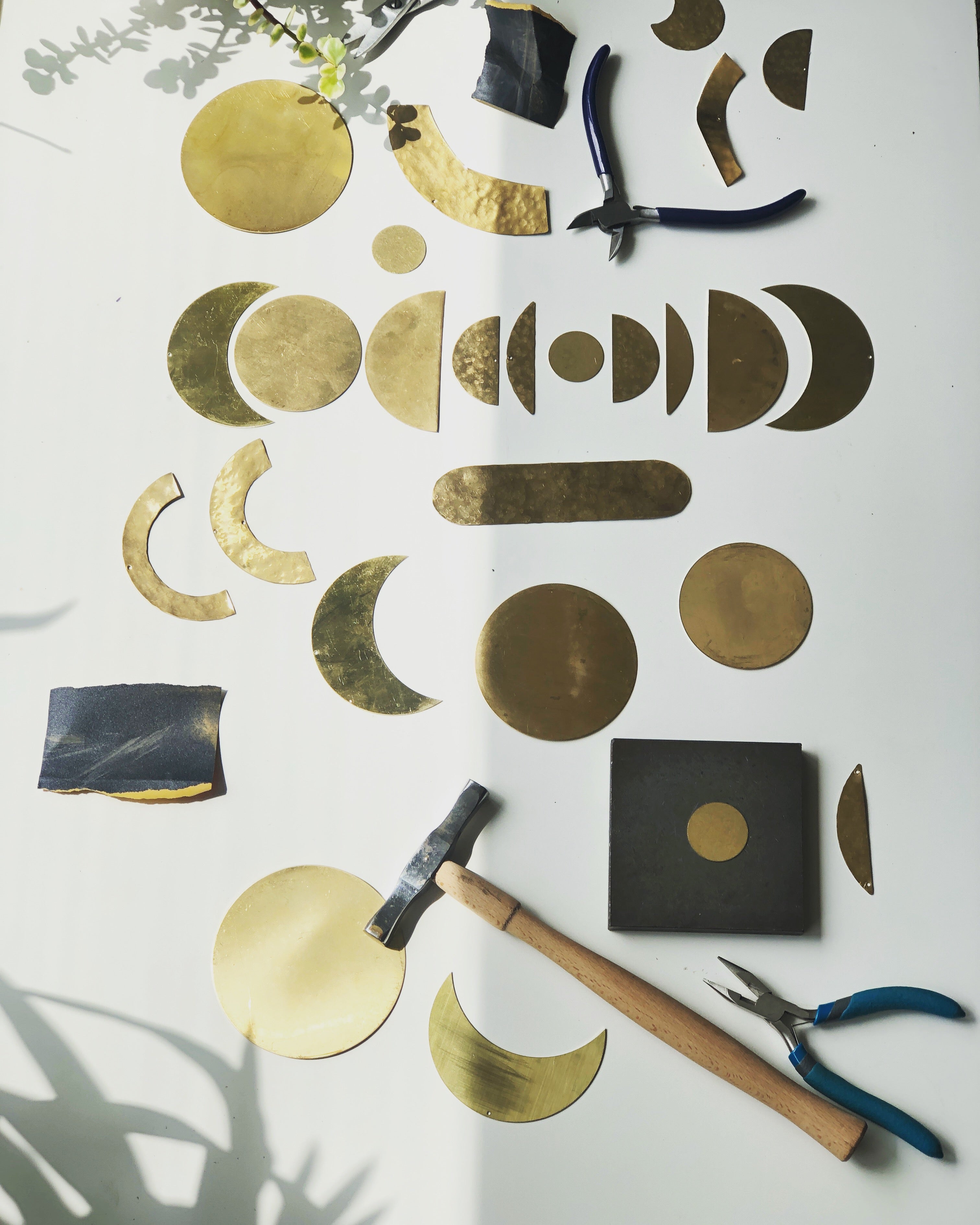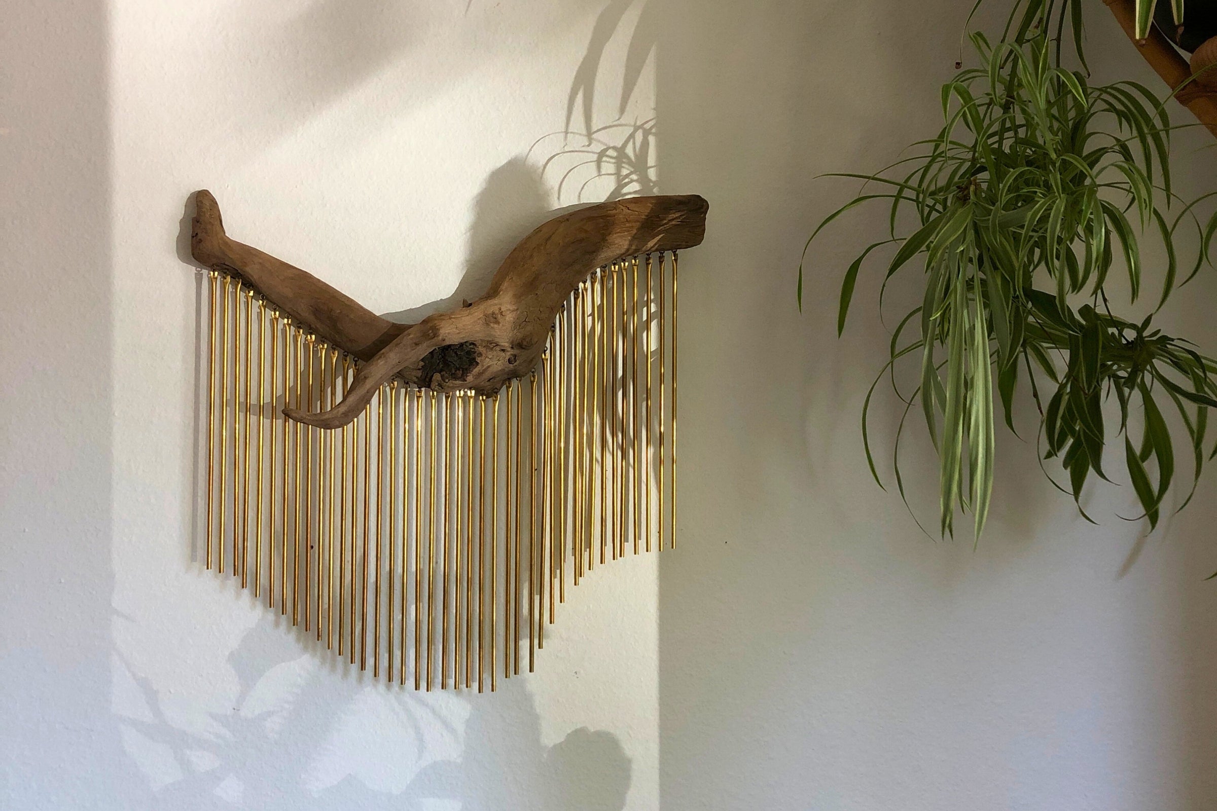 Driftwood + hand cut and hammered brass wall art/mobiles capturing celestial rhythms, ever changing light and reflections on water.