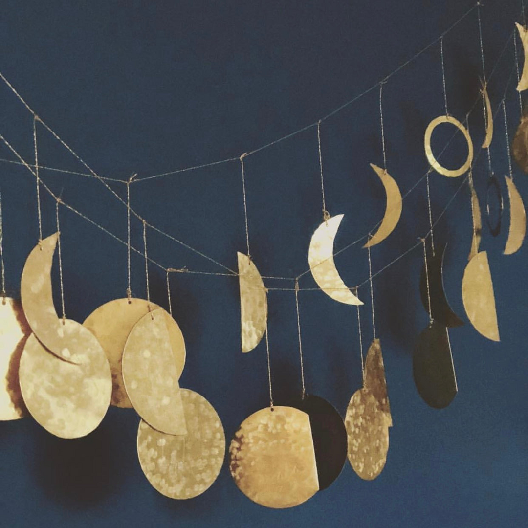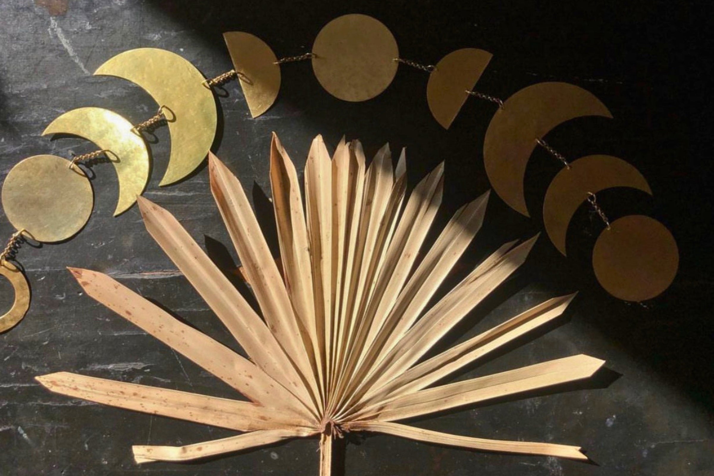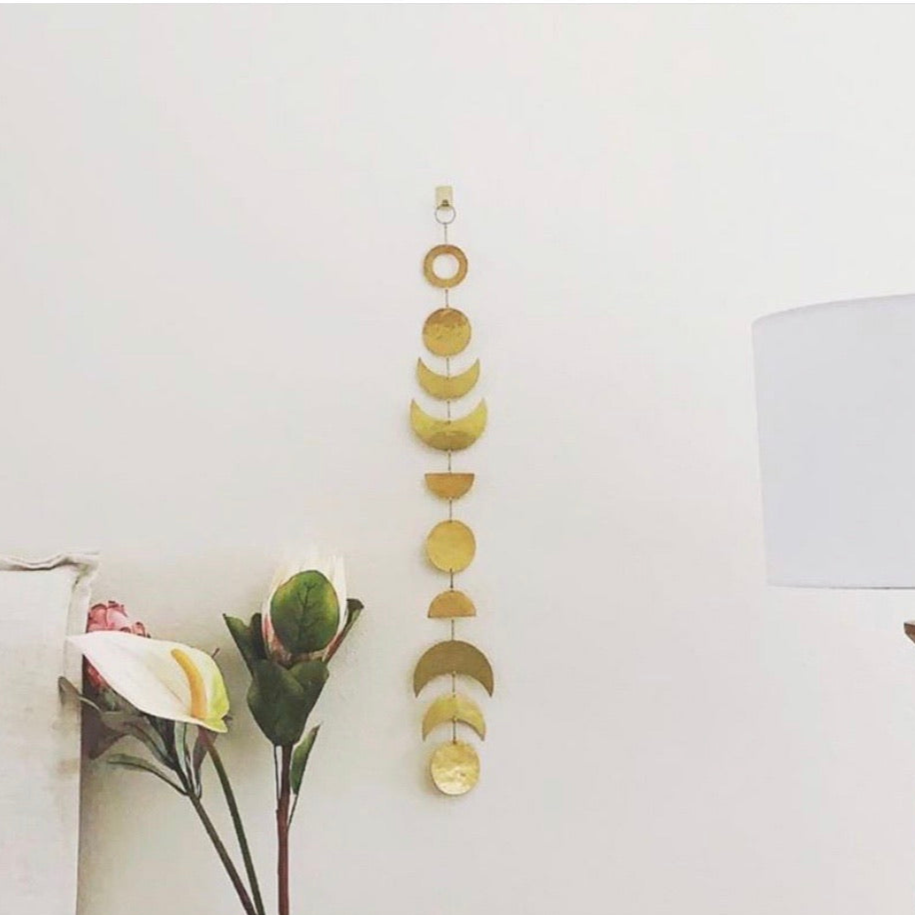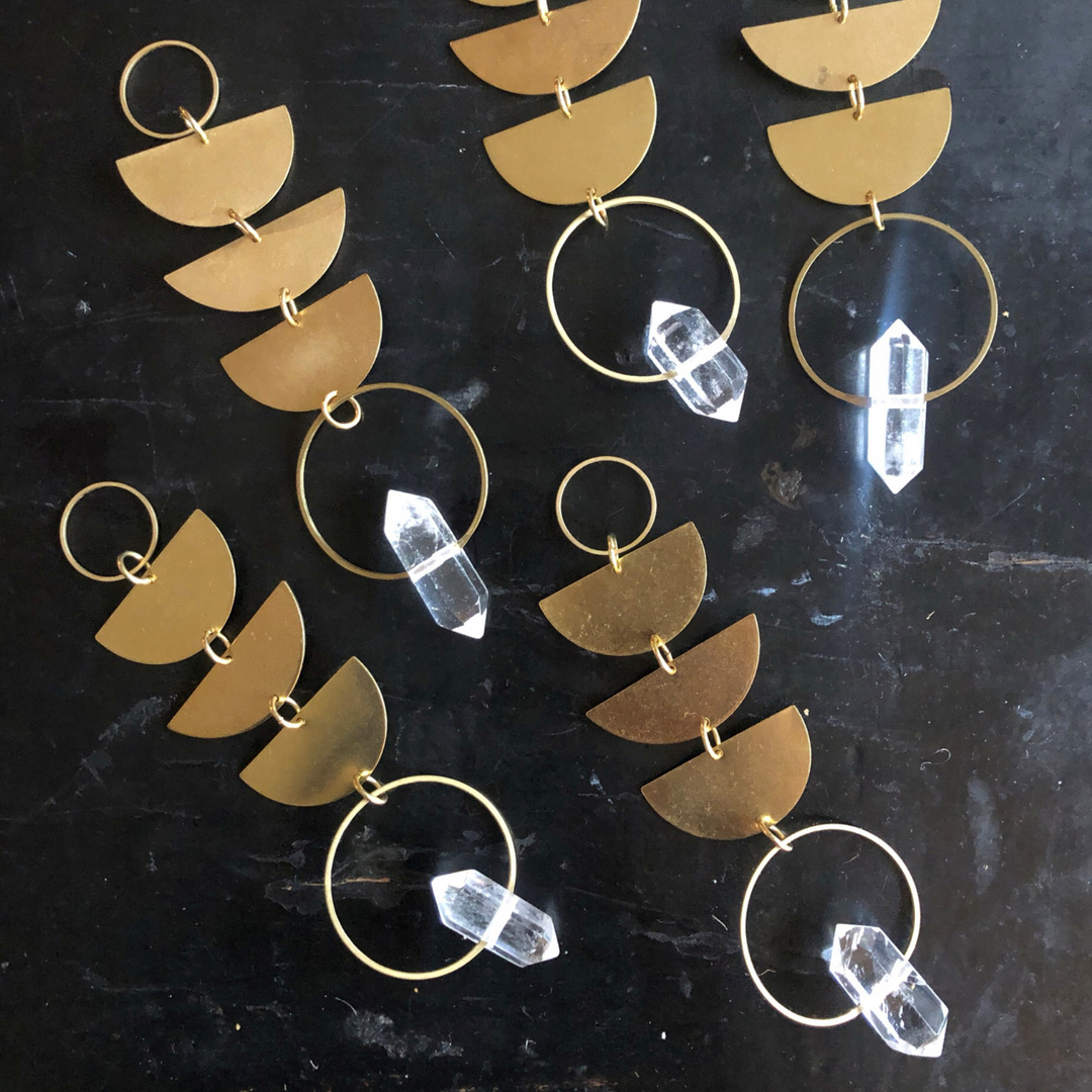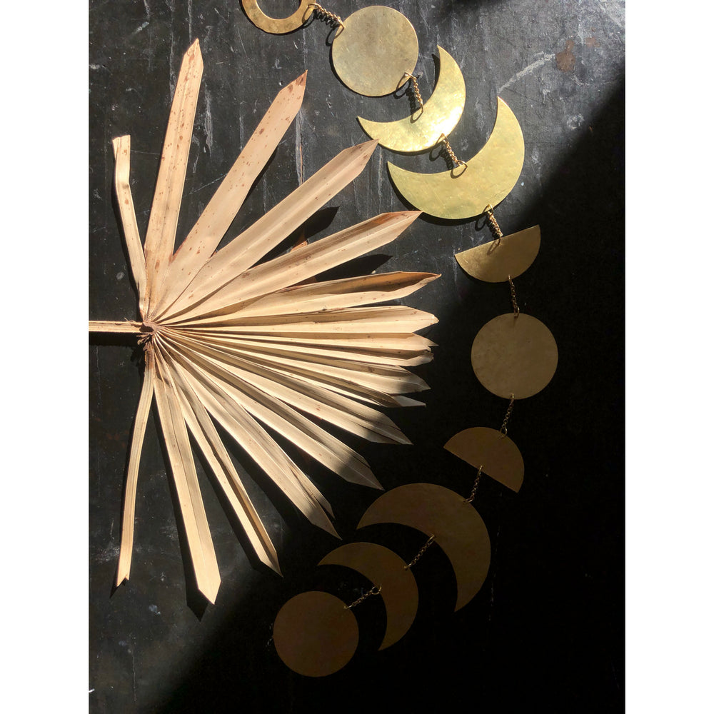 Driftwood + hand cut and hammered brass wall art/mobiles capturing celestial rhythms, ever changing light and reflections on water.