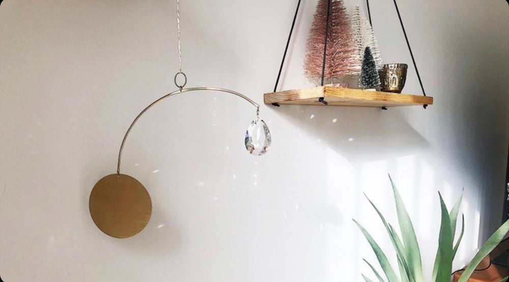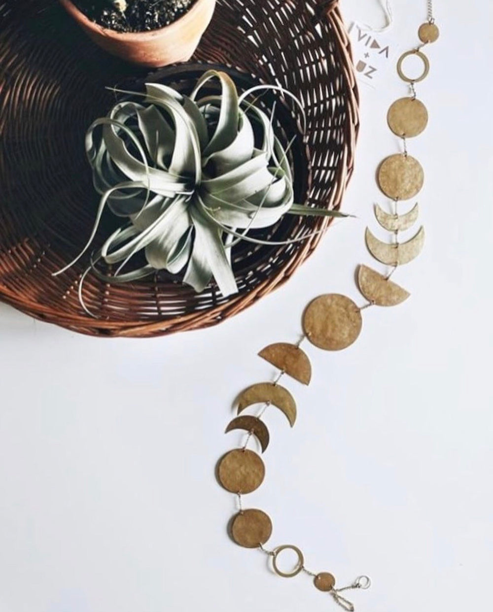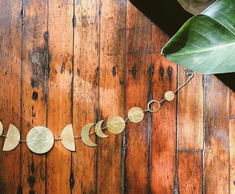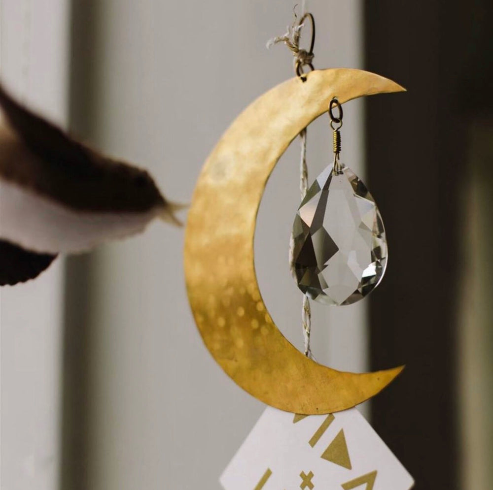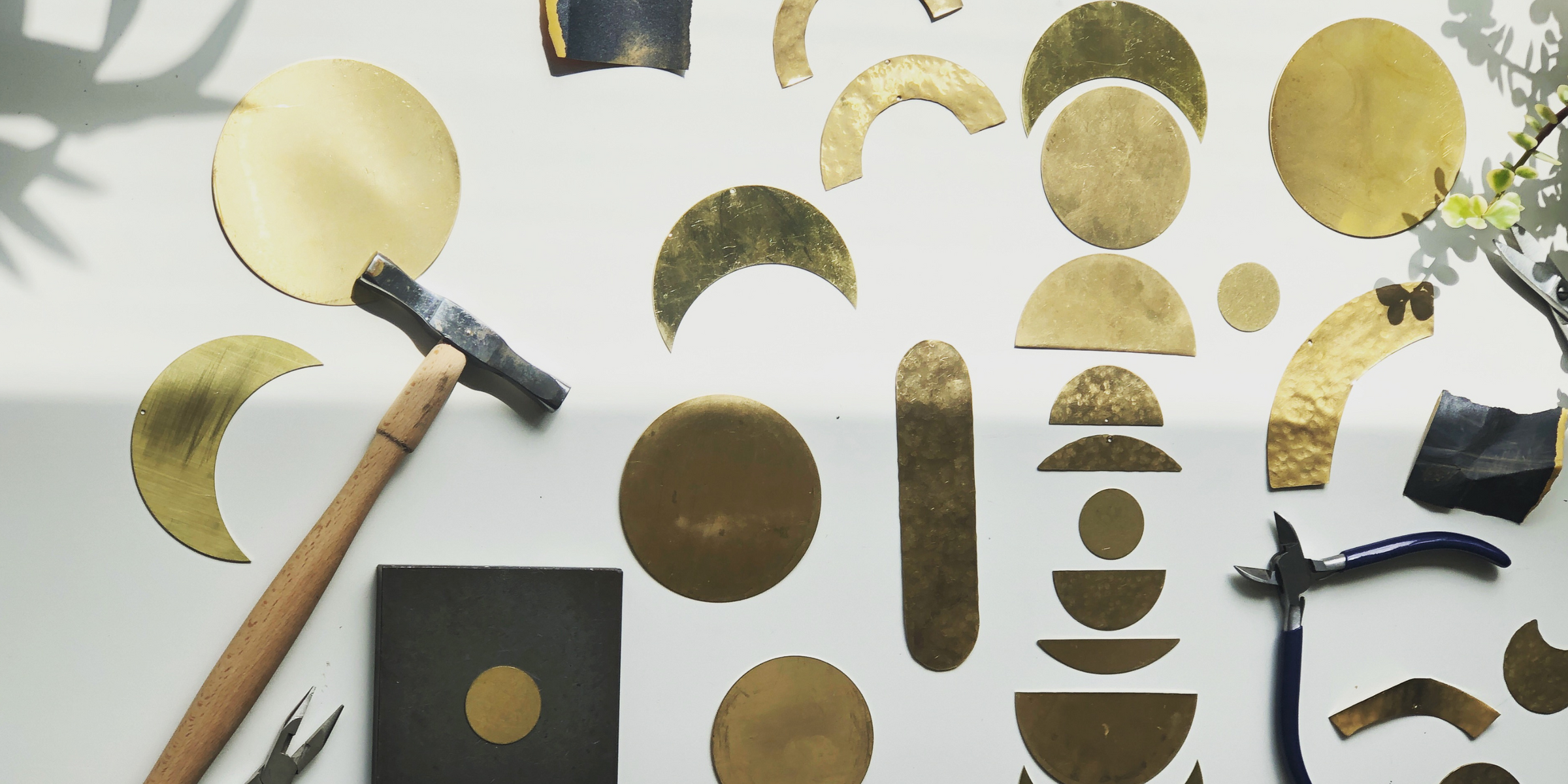 Driftwood + hand cut and hammered brass wall art/mobiles capturing celestial rhythms, ever changing light and reflections on water.