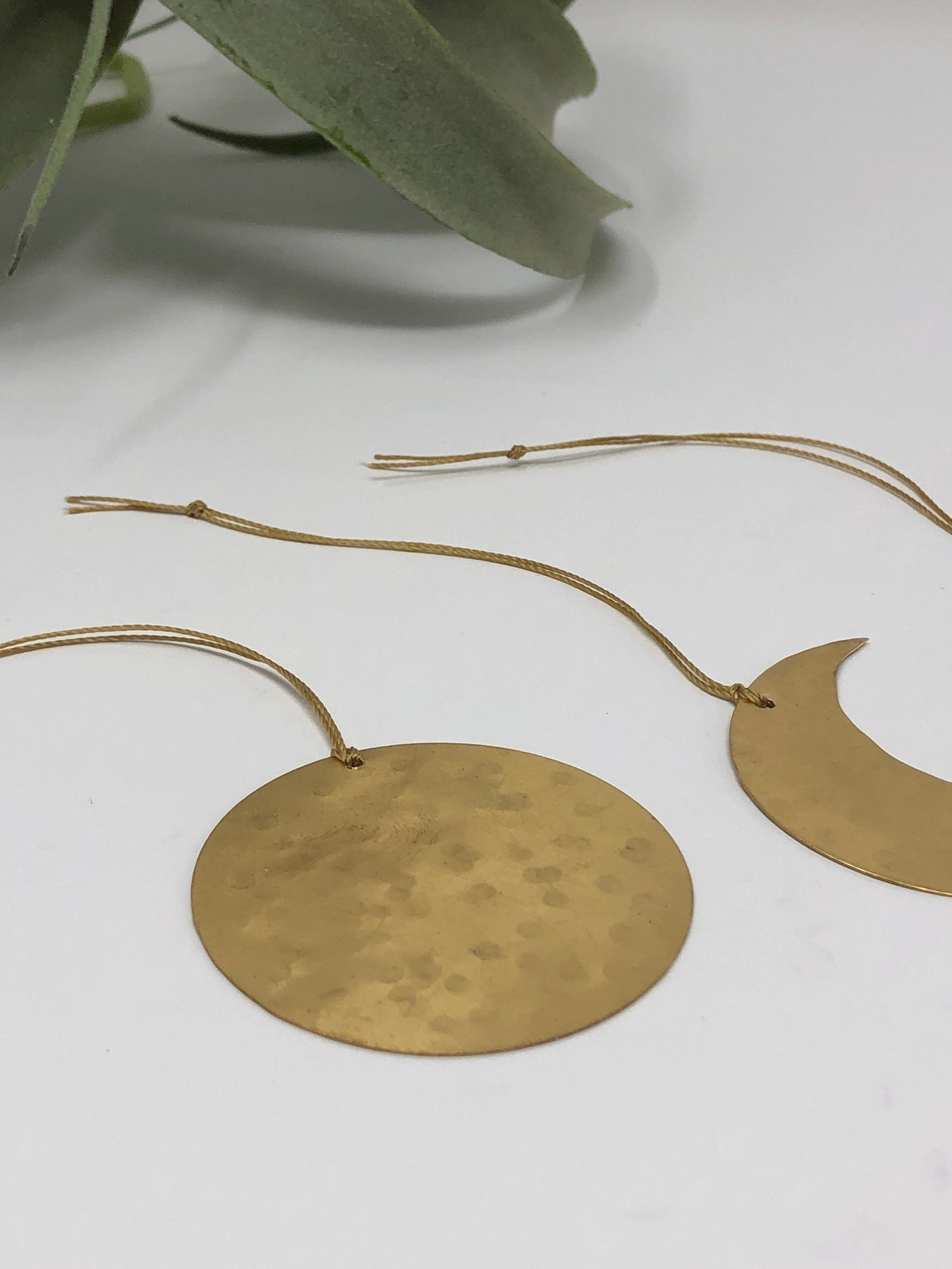 Artisan-crafted 3 piece ornament set made from hand-cut and hammered brass sheet.
