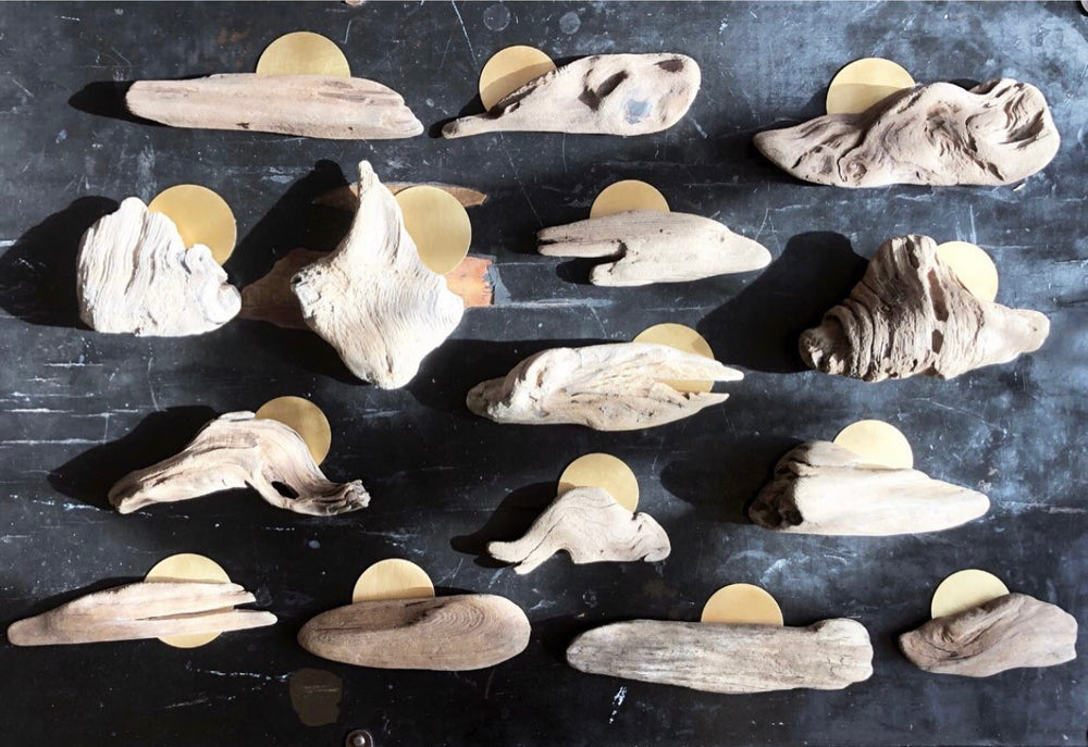 Unique, one-of-a-kind wall sculpture made from naturally-sourced driftwood, hand-cut and hammered brass sheet. Ready to hang.