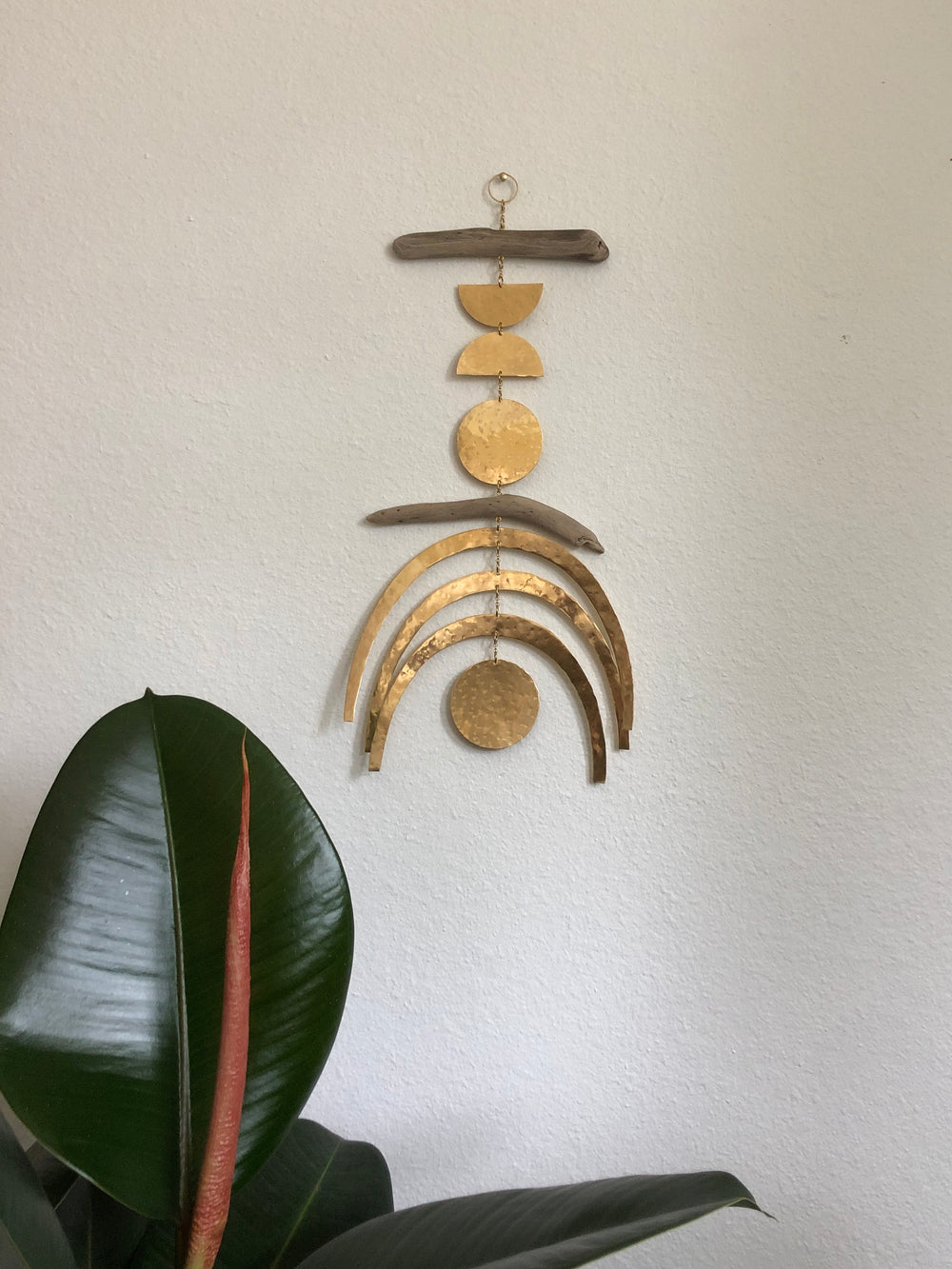 Important Note: Both the wood and brass are untreated, meaning they haven’t been lacquered, stained, or finished. For this reason, we don’t advise placing mobiles or wall hangings outdoors for extended periods.