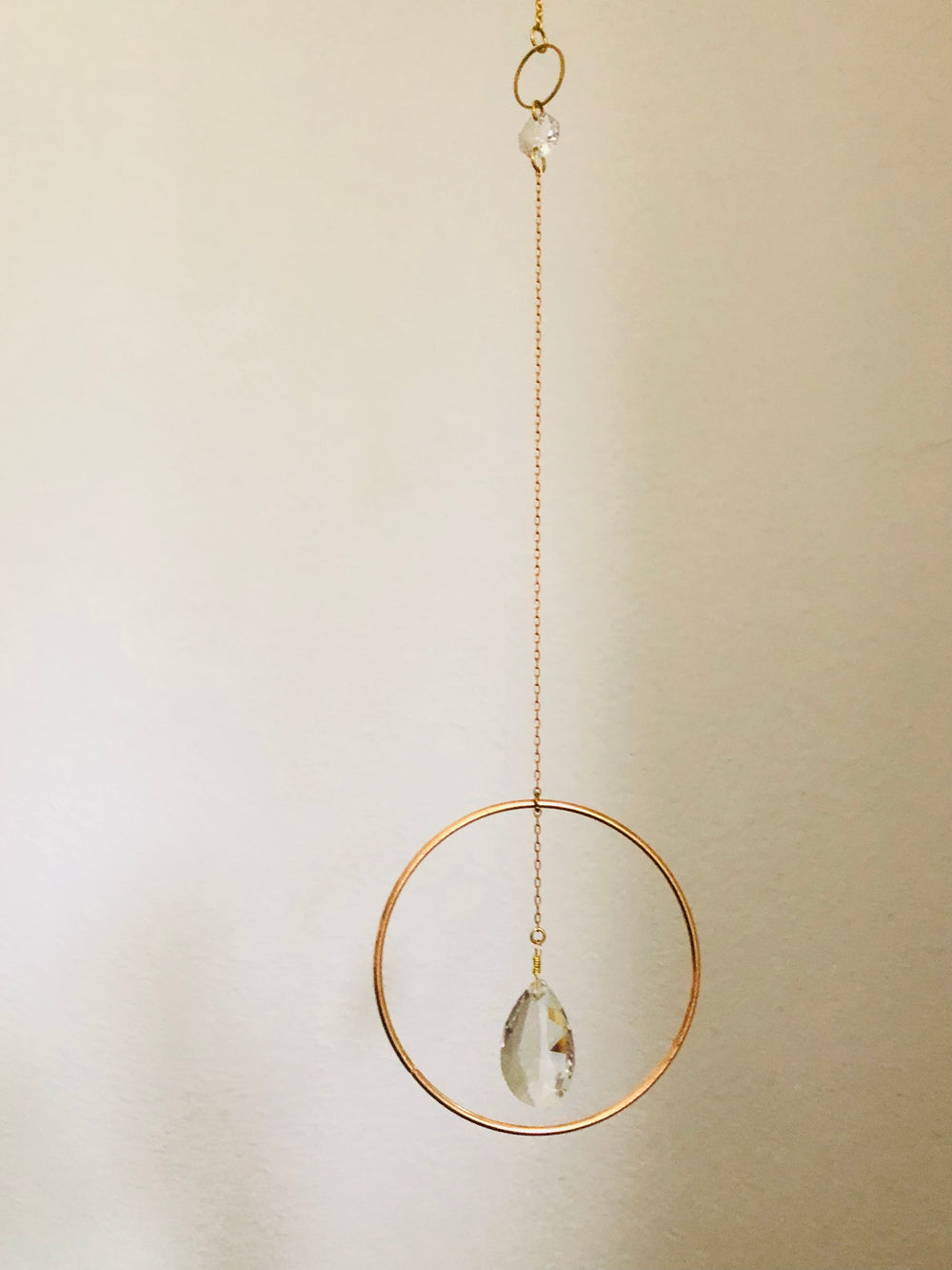 Artisan-crafted suncatcher made from brass wire/chain/tubing plus 2 vintage faceted crystals.