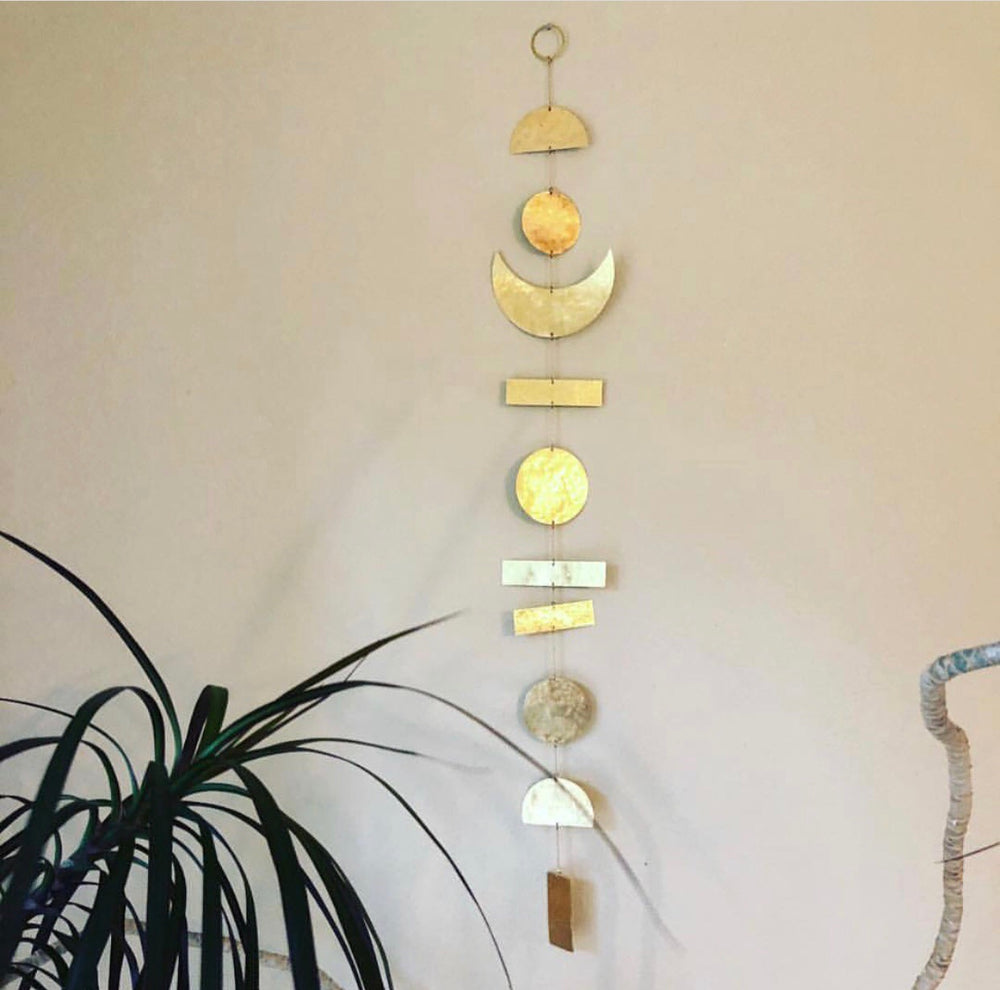 Artisan-crafted wall hanging/mobile made from hand-cut and hammered brass sheet. Ready to hang.